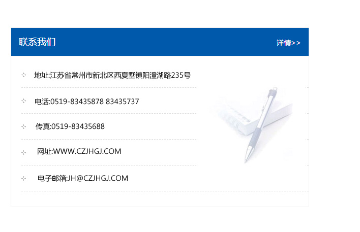 地址:常州市新北區友邦商務大廈1幢16、17層  電話:0519-85101652  傳真:0519-85112595  郵編:213022  網址:www_cz-jiayue_cn.zhuopinyoushang.com  郵箱:xiajifengaa@163.com